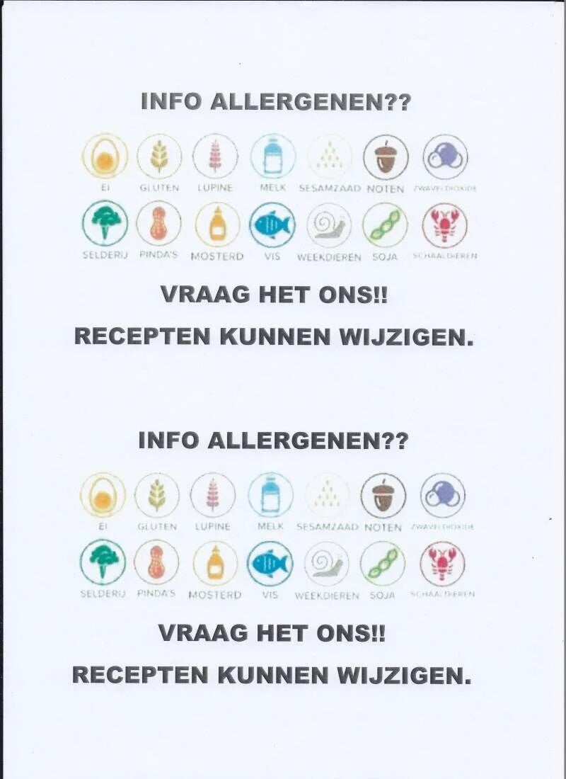 Eiersalade, Salami, Smeerkaas, Choco, Kalfsworst, Cornflakes, fristi of Appelsiensapje, Yoghurt, Fruitsla, Chocolade, Verassing voor